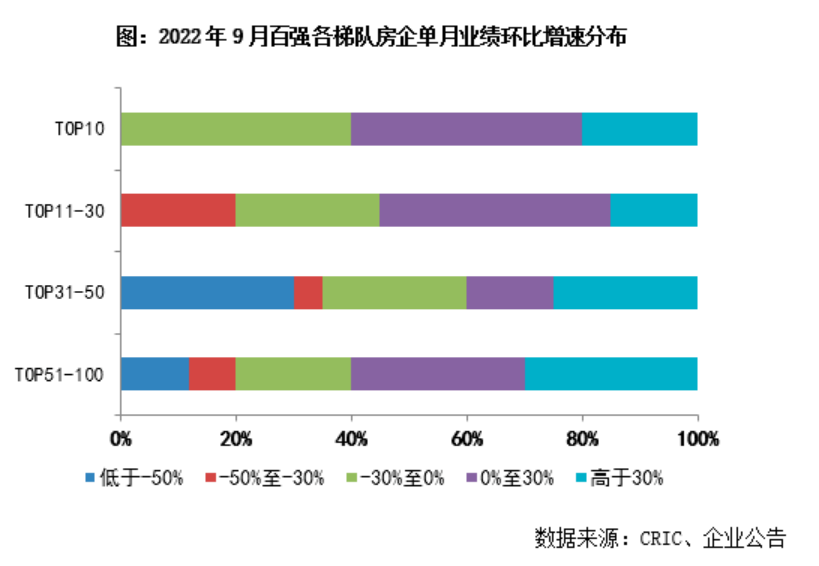 具體從企業(yè)表現(xiàn)來看,克而瑞報(bào)告顯示,2022年9月超半數(shù)百強(qiáng)房企實(shí)現(xiàn)單月業(yè)績(jī)環(huán)比增長,其中30家企業(yè)的環(huán)比增幅在0%到30%之間,25家企業(yè)環(huán)比增幅超過30%。如華潤、招商、綠地、越秀、仁恒等企業(yè)的環(huán)比增幅均在35%以上。但從業(yè)績(jī)同比來看,目前規(guī)模房企整體仍深陷負(fù)增長困局,9月單月業(yè)績(jī)同比降低的企業(yè)數(shù)量達(dá)到近7成,僅3成企業(yè)實(shí)現(xiàn)了單月業(yè)績(jī)同比增長。