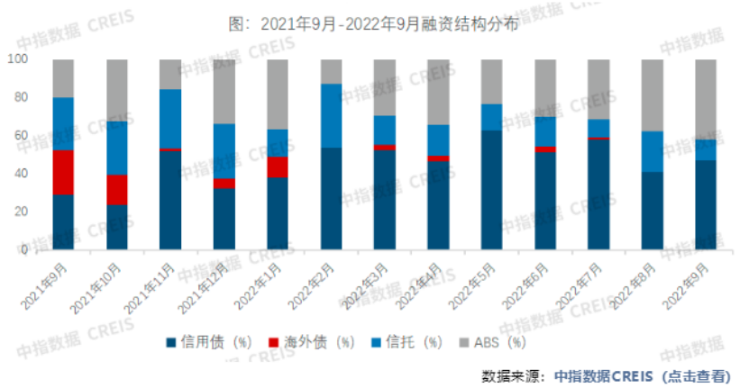 2022年1-9月,房地產(chǎn)企業(yè)非銀融資總額7331.5億元,同比下降52.6%。從融資結(jié)構(gòu)來看,信用債占比50.2%,同比提升19.9個(gè)百分點(diǎn);海外債占比僅為2.4%,同比下降14.0個(gè)百分點(diǎn);信托占比16.0%,同比下降15.1個(gè)百分點(diǎn);ABS占比31.4%,同比提升9.3個(gè)百分點(diǎn)。前三季度非銀融資總額分別占比33.1%、35.1%、32.1%,各季度融資比例差異不大,并未出現(xiàn)明顯的融資高峰期。