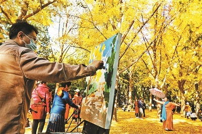 每年一進(jìn)入11月,地壇公園內(nèi)的200余株銀杏樹就被“染成”金黃色,形成“紅墻金葉”這一獨(dú)特景觀,成為京城秋日中一抹靚麗的風(fēng)景。11月1日上午,地壇公園內(nèi)“園林四季 秋之華彩”金秋銀杏活動(dòng)吸引了不少青年藝術(shù)家、廣大藝術(shù)愛好者和游園群眾參與進(jìn)來。陸愛民、李菲、賈見罡、李玉娥、王世高、徐佳、劉玉芬7位畫家相約而來,在地壇公園內(nèi)用手中的畫筆定格美景、描繪金秋。