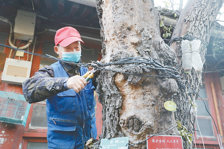 日前,在園林綠化部門、社區(qū)居委會(huì)工作人員的陪同下,東四街道綜合行政執(zhí)法隊(duì)來(lái)到東四六條某平房院。在院落南側(cè)房屋過(guò)道處,一棵樹齡約110年、掛著二級(jí)保護(hù)標(biāo)牌的棗樹特別扎眼。古樹虬曲蒼勁,樹皮斑駁,在樹杈處,數(shù)根電線、鐵絲緊緊纏繞著樹干,由于年代久遠(yuǎn),部分鐵絲已深深嵌進(jìn)了樹皮。居民利用古樹掛衣服、掛盆栽,還在樹身上釘了釘子。古樹根部周圍地面覆蓋了一層厚厚的水泥和瀝青,堆放著廢舊紙箱和花盆等雜物。工作人員立即找來(lái)工具,將樹身上的電線、鐵絲、釘子一一清除,清理了堆放在樹根處的雜物,并對(duì)樹根部的土壤進(jìn)行疏松,使古樹得以“脫困”。