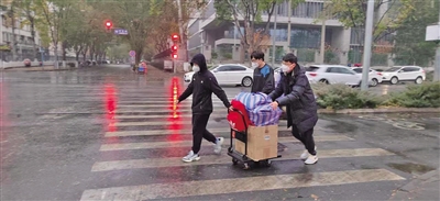 學(xué)校進(jìn)入臨時(shí)管控狀態(tài),但很多學(xué)生人在住宿區(qū)、學(xué)習(xí)物品在北校園的學(xué)習(xí)區(qū),怎么辦?該校通過接訴即辦平臺收到學(xué)生的反映后,立即作出決策,成立物品傳遞轉(zhuǎn)運(yùn)隊(duì)伍,幫助學(xué)生解決人與學(xué)習(xí)物品分離的問題,學(xué)院書記、院長和師生志愿者立即行動起來組建搬運(yùn)隊(duì)伍,有的在校內(nèi)幫忙打包學(xué)生物資,有的在校外接應(yīng)、及時(shí)將學(xué)生所需物資送到學(xué)生手里。