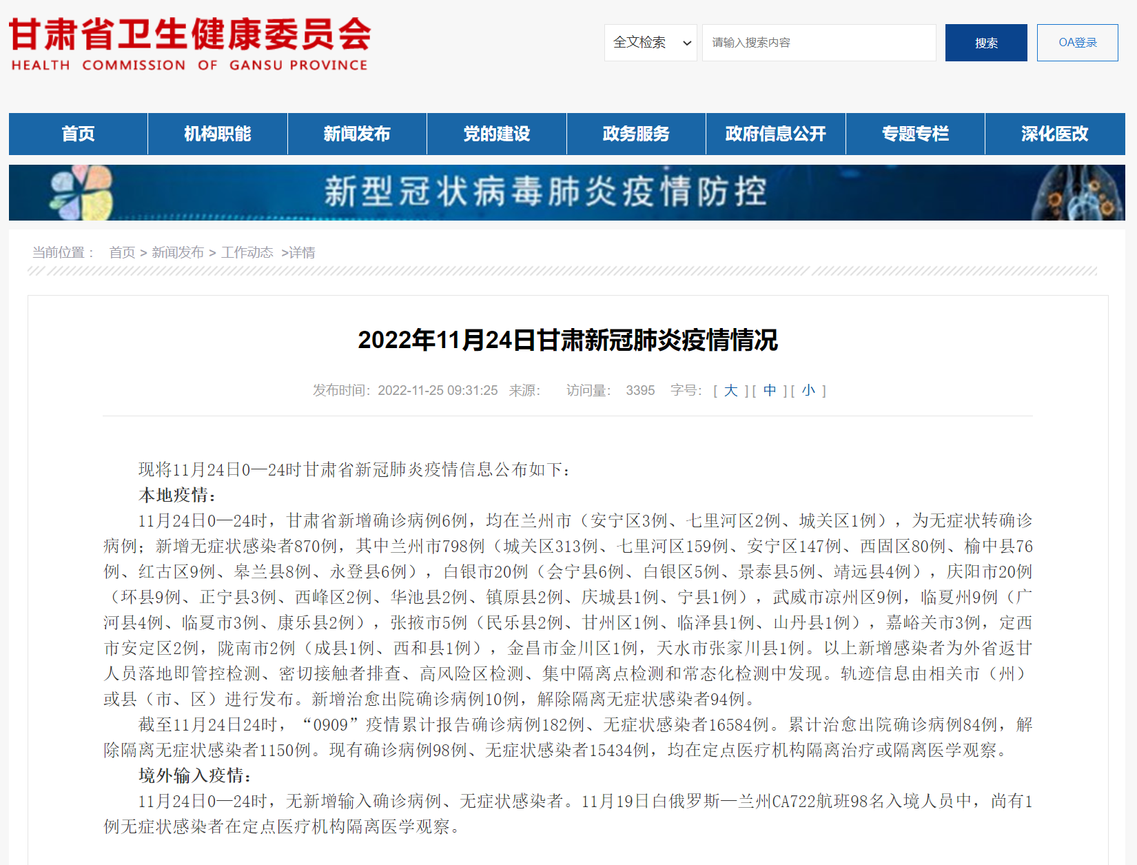 11月24日甘肅新增確診病例6例,無(wú)癥狀感染者870例