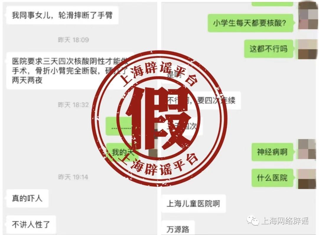 “上海一醫(yī)院要求兒童三天四次核酸才能做手術(shù),孩子骨折小臂斷裂,硬抗了兩天兩夜?!辈痪们埃粭l聊天記錄在陸先生的家屬群引發(fā)熱議。因?yàn)楸斫阋患疑钤谏虾?,親戚還特意提醒她照顧好孩子。而很快,官方發(fā)布辟謠消息,稱(chēng)經(jīng)過(guò)多路求證,聊天記錄中所指醫(yī)院并沒(méi)有三天四次核酸檢測(cè)陰性才能手術(shù)的要求,院方也未核查到存在所傳相似情況的病人。