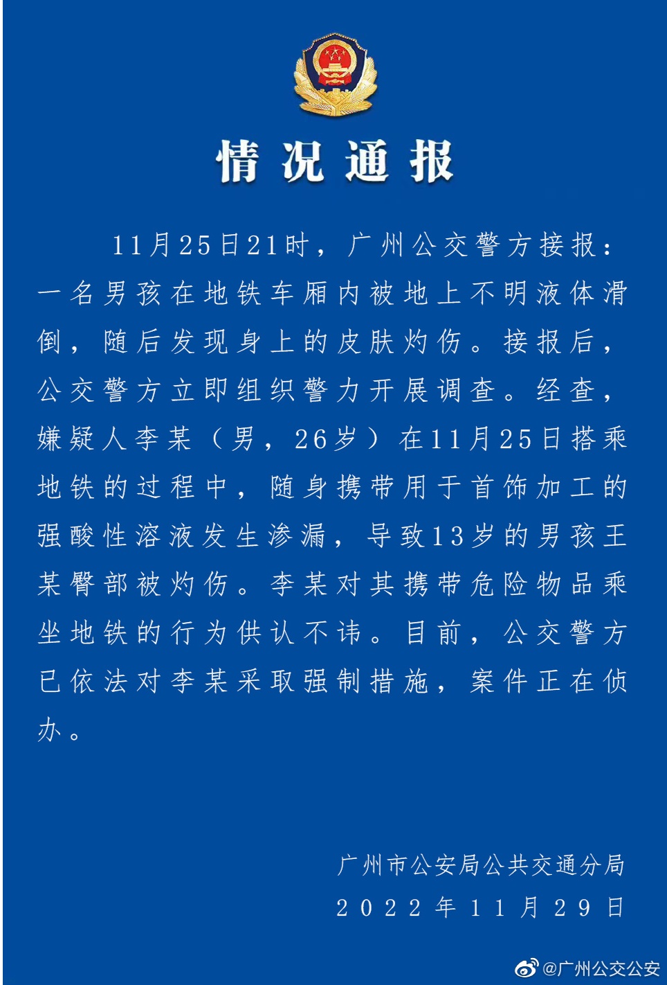 通報(bào)顯示,25日21時(shí),廣州公交警方接報(bào)稱,一名男孩在地鐵車廂內(nèi)被地上不明液體滑倒,隨后發(fā)現(xiàn)身上的皮膚灼傷。接報(bào)后,公交警方立即組織警力開展調(diào)查。經(jīng)查,嫌疑人李某(男,26歲)在11月25日搭乘地鐵的過程中,隨身攜帶用于首飾加工的強(qiáng)酸性溶液發(fā)生滲漏,導(dǎo)致13歲的男孩王某臀部被灼傷。李某對其攜帶危險(xiǎn)物品乘坐地鐵的行為供認(rèn)不諱。