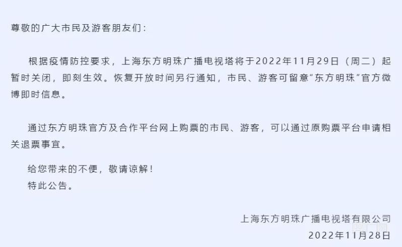 上海東方明珠廣播電視塔有限公司28日晚發(fā)布公告稱,根據(jù)疫情防控要求,上海東方明珠廣播電視塔于2022年11月29日起暫時關(guān)閉,即刻生效。恢復(fù)開放時間另行通知,市民、游客可留意“東方明珠”官方微博即時信息。