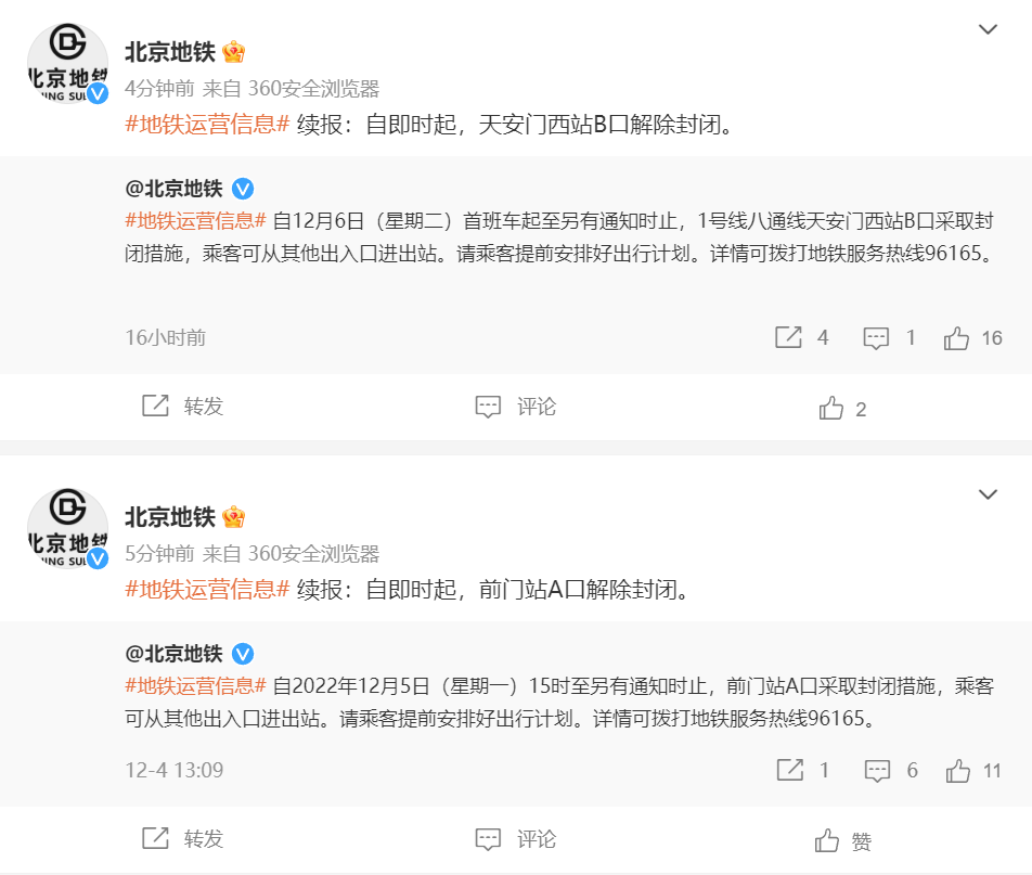 據(jù)@北京地鐵 微博消息,1號(hào)線八通線前門站A口、天安門西站B口解除封閉。