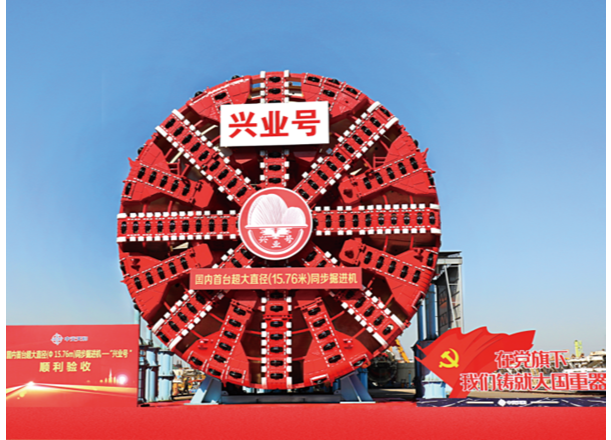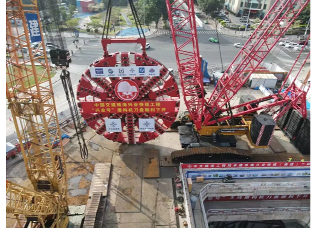 珠海興業(yè)快線隧道工程是未來連通港珠澳大橋和深中通道,把珠海市打造成為“粵港澳交通樞紐”的重要工程。盾構(gòu)隧道長度僅1740米,但地質(zhì)情況極為復(fù)雜,其中:硬巖段占比超過70%,被稱“地質(zhì)博物館”,且為首個國內(nèi)直徑最大雙層疊落盾構(gòu)工程,雙層疊落長約604米,盾構(gòu)法施工面臨不少世界級難題。為順利完成這項重大工程,中交天和立足自主研發(fā),著眼科技創(chuàng)新,為適應(yīng)在硬巖地質(zhì)中提高掘進(jìn)速度,實現(xiàn)隧道掘進(jìn)和管片拼裝同步施工,成功研制中國首臺超大直徑同步掘進(jìn)機“興業(yè)號”。該掘進(jìn)機國產(chǎn)化率達(dá)98%以上、刀盤直徑15.76米,全長超130米,攻克了許多難以想象的世界級難題。