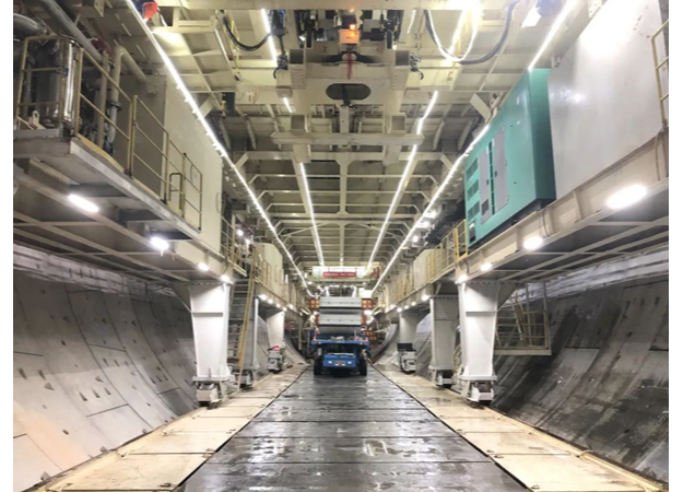 珠海興業(yè)快線隧道工程現(xiàn)場,一臺重4500噸、超5層樓高的“地下航母”正奮勇掘進(jìn),管片一片一片拼裝,隧道隨之一米一米建成。這臺“地下航母”,就是由中交天和自主研制的中國首臺超大直徑同步掘進(jìn)機“興業(yè)號”,這也是國內(nèi)首次采用的同步掘進(jìn)設(shè)計。常規(guī)隧道掘進(jìn)機拼裝管片,一環(huán)管片寬2米,刀頭油缸推動,而油缸推動距離僅為2米多。因而,掘進(jìn)2米后必須停止,掘進(jìn)一環(huán)耗時近60分鐘,拼裝管片一環(huán)耗時近45分鐘。“興業(yè)號”的關(guān)鍵在于同步掘進(jìn),它改變了傳統(tǒng)油缸設(shè)計,推動距離可延長至4米,刀頭可實現(xiàn)持續(xù)掘進(jìn),后方同時拼裝管片,施工速度較國內(nèi)外同類掘進(jìn)機提升25-35%,對超大直徑盾構(gòu)機發(fā)展具有一定劃時代意義。