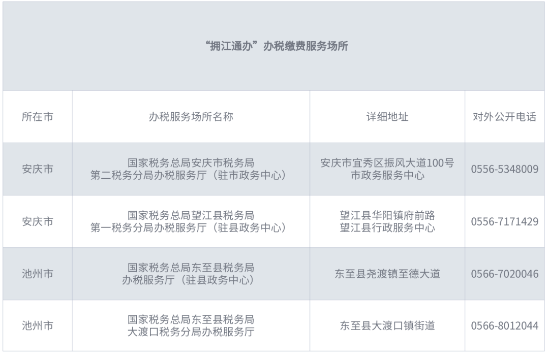 2.通辦場所。1.國家稅務(wù)總局安慶市稅務(wù)局第二稅務(wù)分局辦稅服務(wù)廳(駐市政務(wù)中心);2.國家稅務(wù)總局望江縣稅務(wù)局第一稅務(wù)分局辦稅服務(wù)廳(駐縣政務(wù)中心);3.國家稅務(wù)總局東至縣稅務(wù)局辦稅服務(wù)廳(駐縣政務(wù)中心);4.國家稅務(wù)總局東至縣稅務(wù)局大渡口稅務(wù)分局辦稅服務(wù)廳,以上4個辦稅繳費(fèi)場所均可辦理“擁江通辦”事項(xiàng),辦稅繳費(fèi)場所詳見附件1。