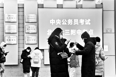 昨日早上8點(diǎn),北京師范大學(xué)第三附屬中學(xué)的考點(diǎn)已有考生陸續(xù)到場(chǎng)。一些公考輔導(dǎo)機(jī)構(gòu)在考點(diǎn)門前派發(fā)復(fù)習(xí)資料,北京青年報(bào)記者看到,黨的二十大報(bào)告,北京冬奧會(huì)、冬殘奧會(huì),2022年中央一號(hào)文件等時(shí)事熱點(diǎn)都被列為重點(diǎn)內(nèi)容。8點(diǎn)20分,考生開始入場(chǎng)。工作人員手持測(cè)溫儀,對(duì)每個(gè)考生進(jìn)行測(cè)溫。考點(diǎn)內(nèi)的一樓也設(shè)置了兩個(gè)備用考場(chǎng)。據(jù)悉,按照要求,有發(fā)熱(體溫≥37.3℃)等可疑癥狀的,應(yīng)服從安排在備用考場(chǎng)佩戴N95口罩參加考試。
