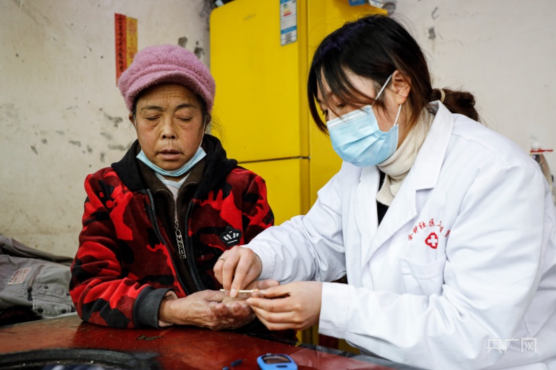 青龍街道金鐘社區(qū)醫(yī)生陳倩為社區(qū)居民測(cè)血糖 (央廣網(wǎng)發(fā) 周海東 攝)