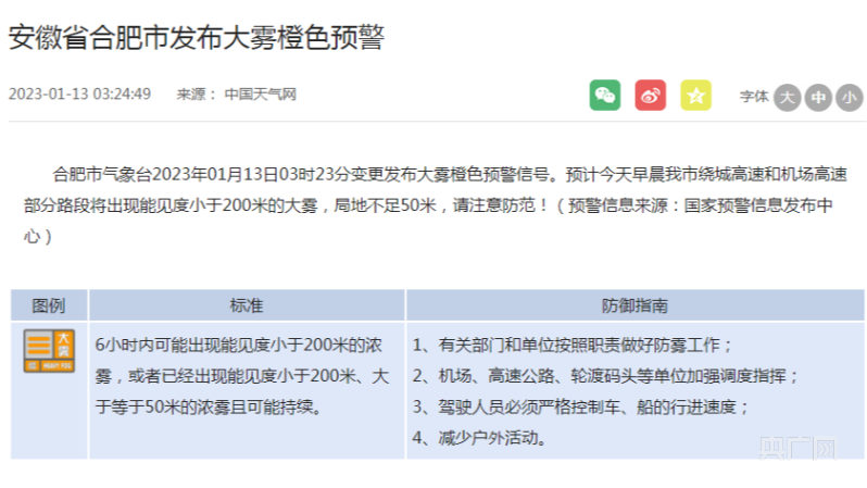 央廣網(wǎng)合肥1月13日消息(記者鮑玉嬋)記者從安徽省氣象局獲悉,合肥市氣象臺(tái)2023年01月13日03時(shí)23分變更發(fā)布大霧橙色預(yù)警信號(hào)。預(yù)計(jì)今天早晨我市繞城高速和機(jī)場高速部分路段將出現(xiàn)能見度小于200米的大霧,局地不足50米,請注意防范!