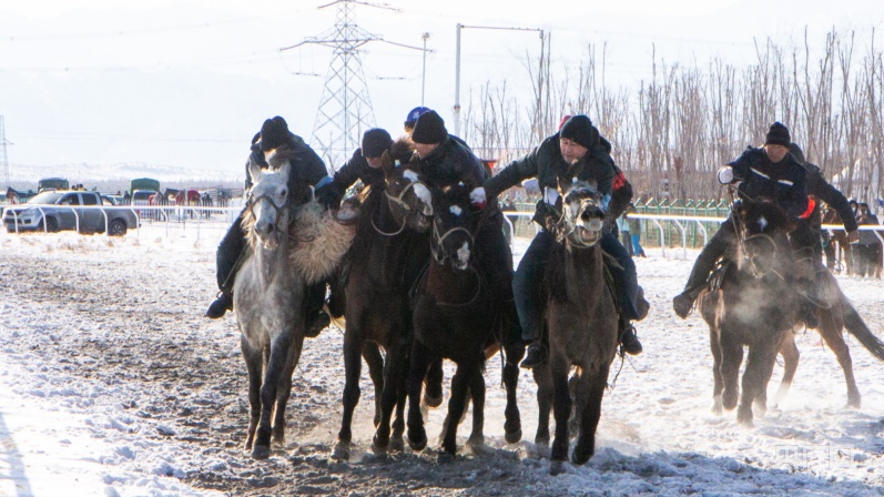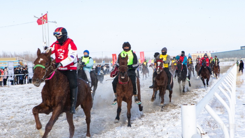 賽馬、斗雞、拔河、叼羊……賽場上選手激情澎湃,賽場下觀眾喝彩不斷。一匹匹風(fēng)馳電掣的駿馬激起雪霧陣陣,騎手們用精湛的馬技點(diǎn)燃寒冬里的激情,一場精彩紛呈的冰雪盛宴正式上演。