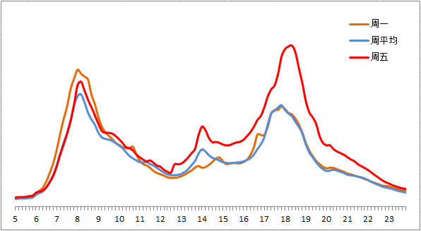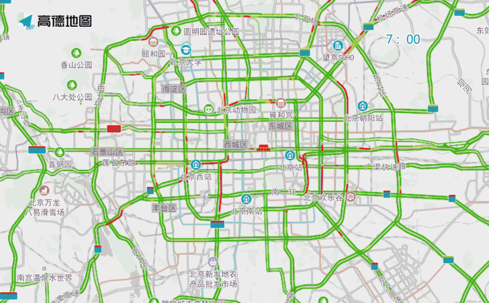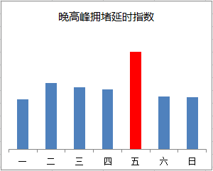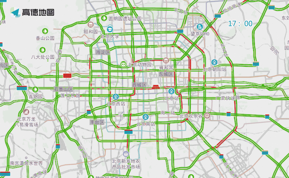 晚高峰期間,東、西、北二、三、四、五環(huán),東六環(huán)部分路段,以及萬(wàn)泉河路至圓明園西路、通惠河北路、蓮石東路等城區(qū)道路出城方向車流集中,京藏高速、京承高速、京通快速、京港澳高速、機(jī)場(chǎng)高速等高速公路出京方向?qū)⒊霈F(xiàn)高峰車流,高峰時(shí)段為17:00—19:00,周五晚高峰提前且持續(xù)時(shí)間較長(zhǎng)。