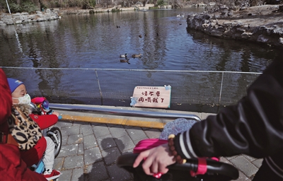 3月16日,北京動物園,水禽湖邊多處設(shè)置了請勿投喂提示牌。