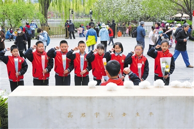 4月5日,陶然亭公園,西羅園第五小學(xué)的少先隊(duì)員們?cè)诟呔盍沂磕骨爸販厝腙?duì)誓詞。新京報(bào)記者 王嘉寧 攝