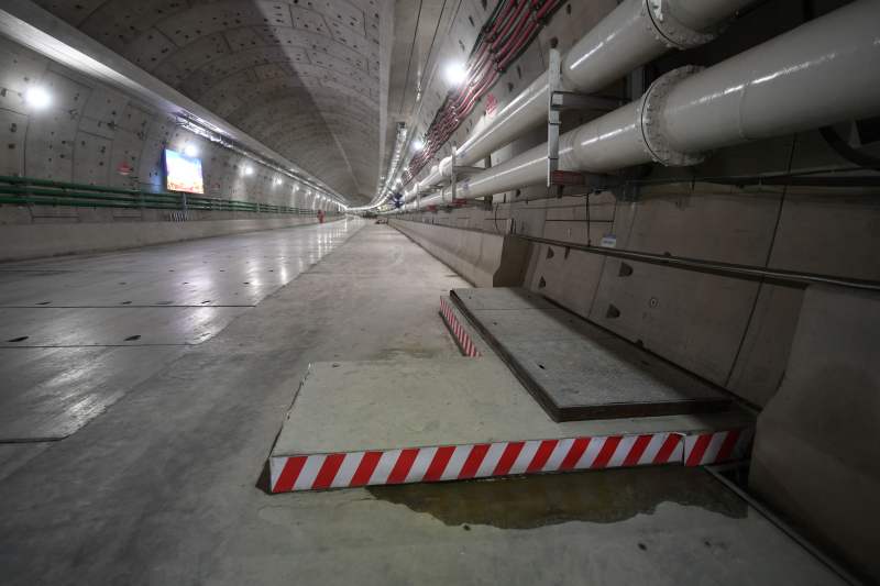 此外,箱涵兩側(cè)分別設置有管廊與人員應急通道,而這些在路面鋪設完畢后都將藏于路面下方,對通行者來說完全是無感的。孫長松指著路面上的一處蓋有擋板的地方告訴記者,這里就是人員應急通道的入口,通車后路面上將設置用液壓控制的智能蓋板,正常狀態(tài)下,它與路面嚴絲合縫地貼在一起,在發(fā)生意外情況、需要疏散人員時,它則會及時開啟。