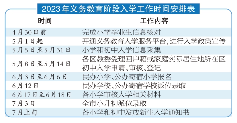 4月30日前,本市將完成小學(xué)畢業(yè)生信息核對(duì);5月1日起,義務(wù)教育入學(xué)服務(wù)平臺(tái)開通,進(jìn)行入學(xué)政策宣傳;5月5日至5月31日,進(jìn)行小學(xué)和初中入學(xué)信息采集。
