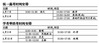 學考等級考科目為思想政治、歷史、地理、物理、化學、生物6門,由考生自主選擇3門參加考試,考試時間為6月9日至10日。