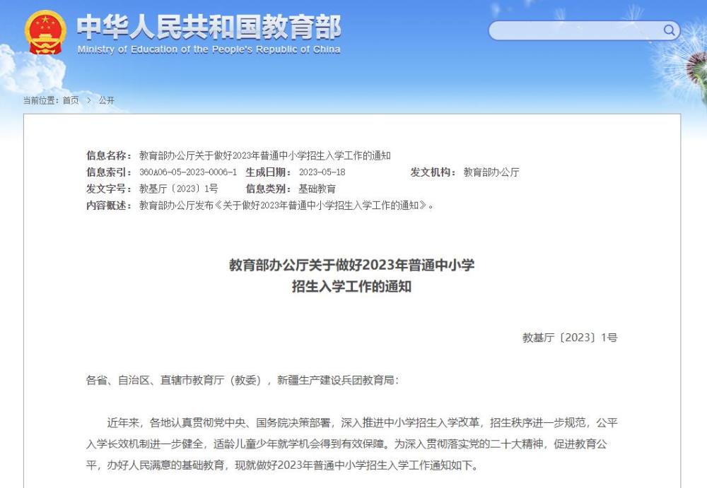 央視網(wǎng)消息:近日,教育部辦公廳發(fā)布《關(guān)于做好2023年普通中小學招生入學工作的通知》。主要內(nèi)容如下: