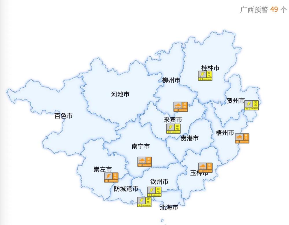 今天(24日),廣西南寧、梧州、玉林等地相繼發(fā)布暴雨、雷電等各類氣象預(yù)警信息,提醒公眾注意做好相關(guān)防范工作。截至24日上午9點30分,全區(qū)各類預(yù)警信息49個。