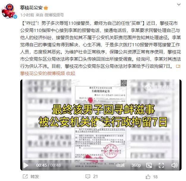 四川攀枝花一男子因多次辱罵110接警員被行拘