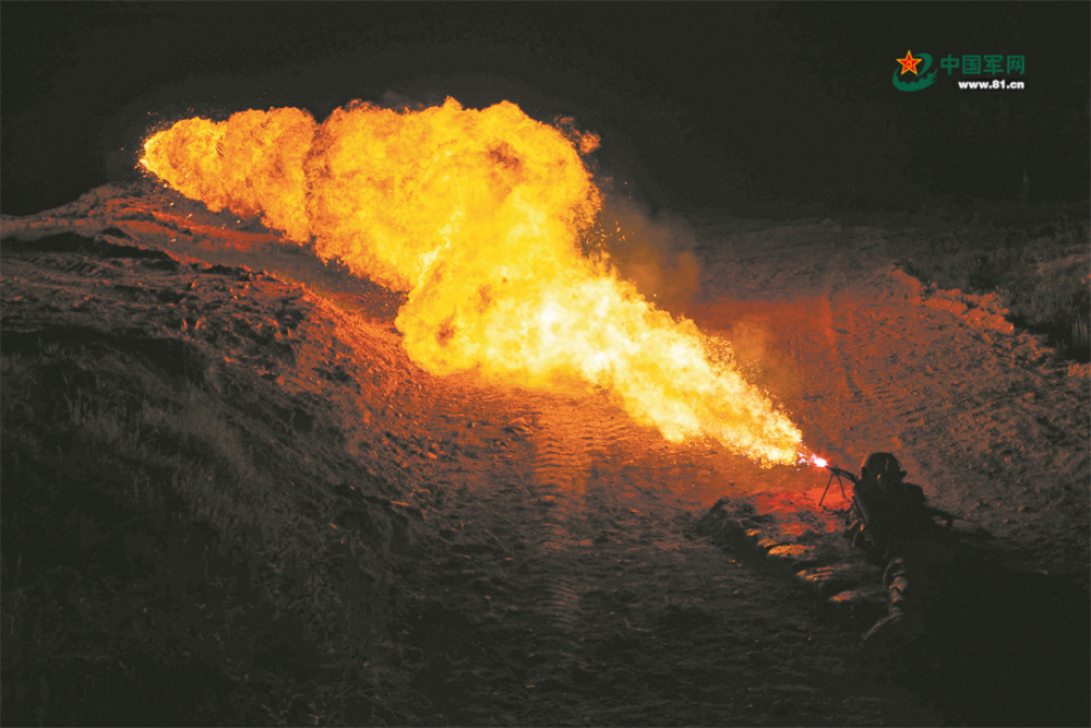 陸軍某旅組織防化分隊(duì)開展夜間噴火器實(shí)噴訓(xùn)練。萬(wàn)智奇 攝
