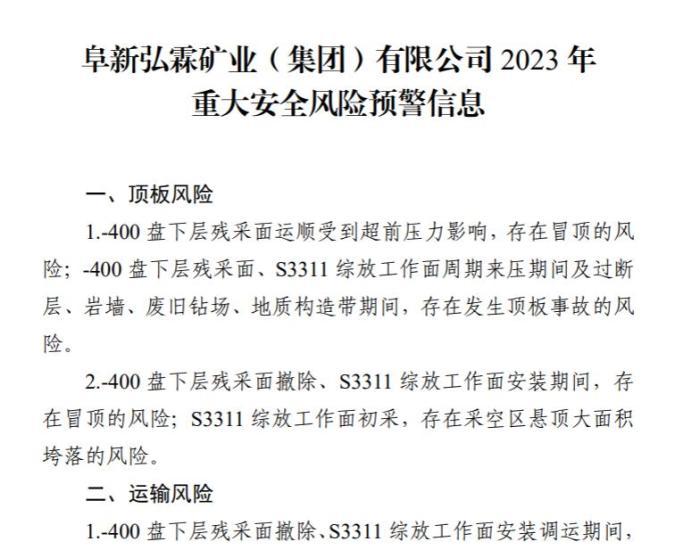 2023年1月,阜新市煤炭工業(yè)轉(zhuǎn)型發(fā)展局發(fā)布阜新市平安礦業(yè)有限責(zé)任公司和阜新弘霖礦業(yè)(集團(tuán))有限公司2023年重大安全風(fēng)險預(yù)警信息。其中提及,阜新弘霖礦業(yè)(集團(tuán))有限公司涉及運輸風(fēng)險、火災(zāi)風(fēng)險、瓦斯風(fēng)險、爆炸風(fēng)險等。(完)