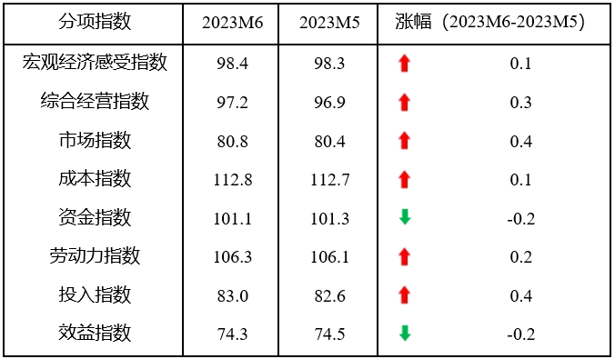 從分項(xiàng)指數(shù)看,6月份,8個分項(xiàng)指數(shù)6升2降,宏觀經(jīng)濟(jì)感受指數(shù)、市場指數(shù)、成本指數(shù)和投入指數(shù)止跌回升,綜合經(jīng)營指數(shù)由平轉(zhuǎn)升,勞動力指數(shù)連續(xù)兩個月上升,資金指數(shù)和效益指數(shù)由升或平轉(zhuǎn)降。