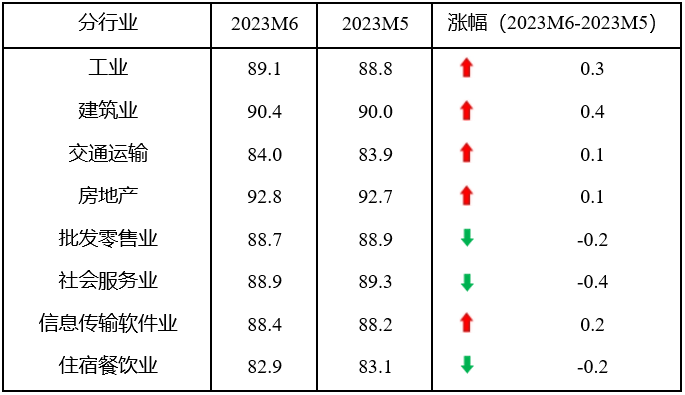 具體來看,6月份,8個分行業(yè)指數(shù)5升3降,工業(yè)、建筑業(yè)、交通運(yùn)輸郵政倉儲業(yè)、房地產(chǎn)業(yè)和信息傳輸計(jì)算機(jī)服務(wù)軟件業(yè)指數(shù)分別上升0.3、0.4、0.1、0.1和0.2點(diǎn),而批發(fā)零售業(yè)、社會服務(wù)業(yè)和住宿餐飲業(yè)指數(shù)分別下降0.2、0.4和0.2點(diǎn)。由此可見,工業(yè)和建筑業(yè)指數(shù)開始回升;而服務(wù)業(yè)指數(shù)的上漲勢頭出現(xiàn)回調(diào)。