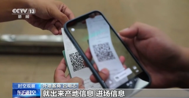外地客商 呂明志:通過(guò)一卡通消費(fèi)了之后,掃上邊這個(gè)追溯碼,就出來(lái)產(chǎn)地信息、進(jìn)場(chǎng)信息、檢測(cè)信息,還有采摘時(shí)間,所以說(shuō)現(xiàn)在很方便,比較安全。