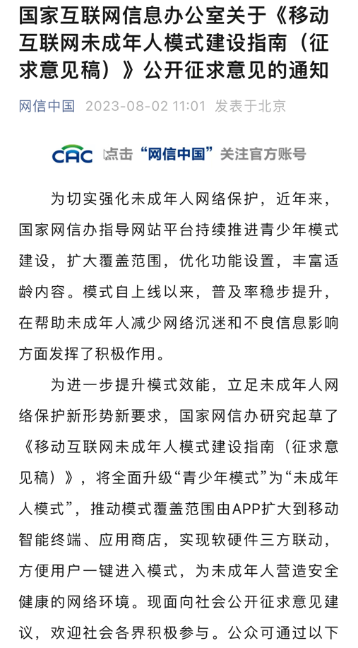 央廣網北京8月3日消息(總臺中國之聲記者馮爍)據中央廣播電視總臺中國之聲報道,為進一步幫助未成年人減少網絡沉迷和不良信息影響,國家網信辦8月2日發(fā)布了關于《移動互聯(lián)網未成年人模式建設指南(征求意見稿)》(以下簡稱《指南》)公開征求意見,將未成年人網絡保護的覆蓋范圍由App擴大到移動智能終端、應用程序、分發(fā)平臺,把“青少年模式”升級為“未成年人模式”。相關部門如何給未成年人網絡保護設置護欄?