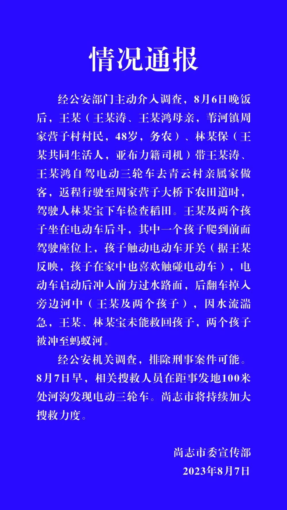 中新網(wǎng)8月8日電 據(jù)尚志市委宣傳部微信公眾號(hào)消息,經(jīng)公安部門主動(dòng)介入調(diào)查,8月6日晚飯后,王某(王某濤、王某鴻母親,葦河鎮(zhèn)周家營子村村民,48歲,務(wù)農(nóng))、林某保(王某共同生活人,亞布力籍司機(jī))帶王某濤、王某鴻自駕電動(dòng)三輪車去青云村親屬家做客,返程行駛至周家營子大橋下農(nóng)田道時(shí),駕駛?cè)肆帜硨毾萝嚈z查稻田。王某及兩個(gè)孩子坐在電動(dòng)車后斗,其中一個(gè)孩子爬到前面駕駛座位上,孩子觸動(dòng)電動(dòng)車開關(guān)(據(jù)王某反映,孩子在家中也喜歡觸碰電動(dòng)車),電動(dòng)車啟動(dòng)后沖入前方過水路面,后翻車掉入旁邊河中(王某及兩個(gè)孩子),因水流湍急,王某、林某寶未能救回孩子,兩個(gè)孩子被沖至螞蟻河。