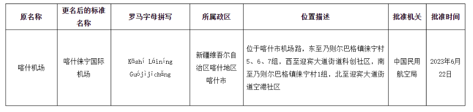 據(jù)民政部發(fā)布公告,經(jīng)中國(guó)民用航空局批準(zhǔn),喀什機(jī)場(chǎng)更名為喀什徠寧國(guó)際機(jī)場(chǎng)。