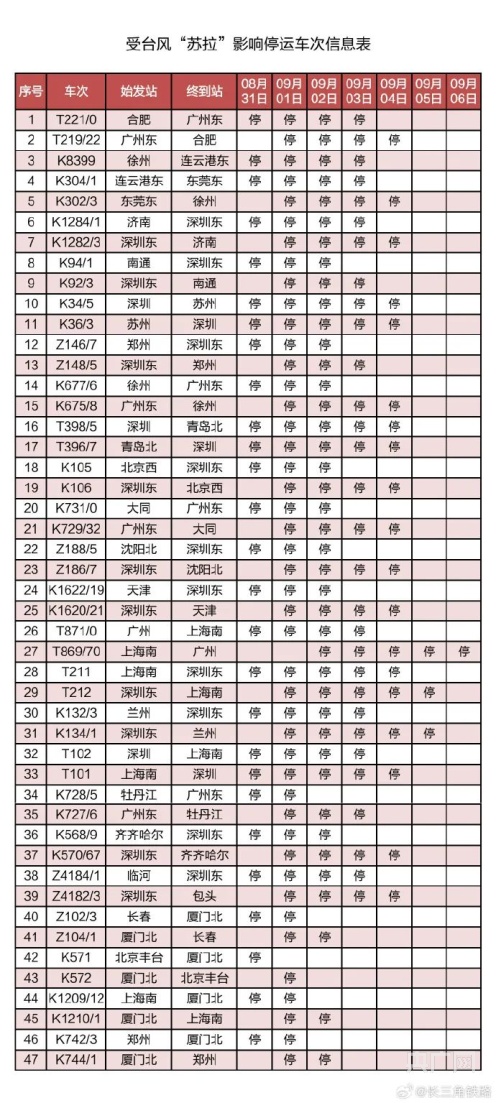 記者從中國(guó)鐵路上海局集團(tuán)有限公司獲悉,受第9號(hào)臺(tái)風(fēng)“蘇拉”影響,為確保列車(chē)運(yùn)行安全,鐵路部門(mén)計(jì)劃對(duì)杭深線(xiàn)、京港高鐵、廣深城際、廣深港高鐵、穗深城際、京九線(xiàn)等線(xiàn)路運(yùn)行的部分列車(chē)采取停運(yùn)措施。截至30日17時(shí)30分,計(jì)劃停運(yùn)8月31日至9月6日間共121趟旅客列車(chē):其中停運(yùn)動(dòng)車(chē)組列車(chē)74趟,停運(yùn)普速列車(chē)47趟。