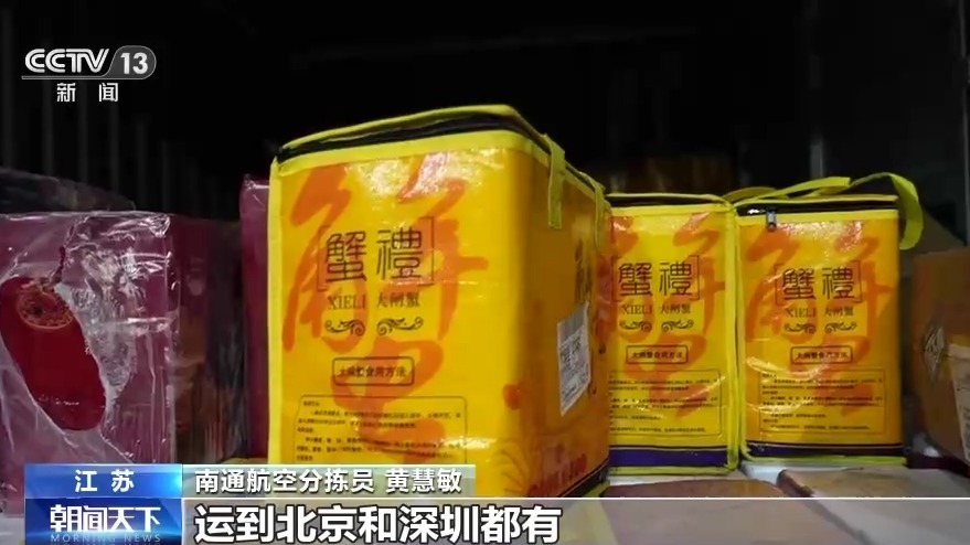 南通航空分揀員 黃慧敏:這批是來的鎮(zhèn)江郭莊來的大閘蟹,已經開始分揀了,運到北京和深圳都有。