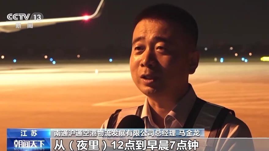 南通滬通空港物流發(fā)展有限公司總經理 馬金龍:從夜里12點到早晨7點鐘,陸續(xù)有8個航班離港,目的站主要是廣州、深圳、北京幾個機場。