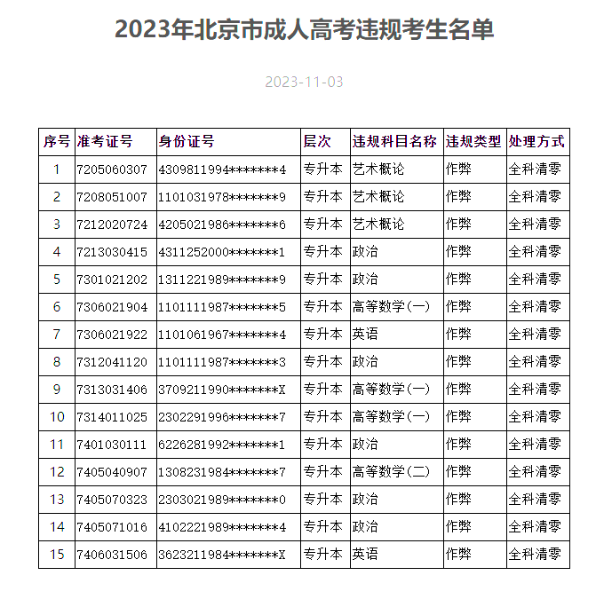 2023年北京市成人高考違規(guī)考生名單(圖源:北京教育考試院)