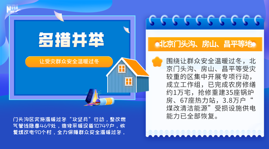 圍繞讓群眾安全溫暖過(guò)冬,北京門(mén)頭溝、房山、昌平等受災(zāi)較重的區(qū)集中開(kāi)展專項(xiàng)行動(dòng),成立工作組,已完成農(nóng)房修繕約1萬(wàn)宅,搶修重建35座鍋爐房、67座熱力站,3.8萬(wàn)戶“煤改清潔能源”受損設(shè)施供電能力已全部恢復(fù)。
