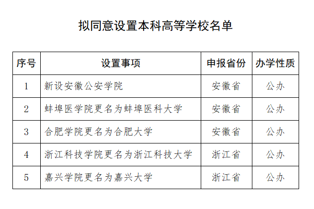 根據(jù)《中華人民共和國高等教育法》《普通高等學(xué)校設(shè)置暫行條例》《普通本科學(xué)校設(shè)置暫行規(guī)定》有關(guān)規(guī)定以及第八屆全國高等學(xué)校設(shè)置評議委員會(huì)考察評議結(jié)果,經(jīng)教育部黨組會(huì)議審議,擬同意設(shè)置安徽公安學(xué)院等5所學(xué)校,現(xiàn)予公示。公示時(shí)間為2023年11月20日至11月24日。