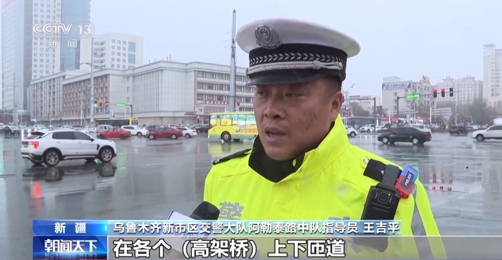 烏魯木齊新市區(qū)交警大隊阿勒泰路中隊指導員 王吉平:交警部門前期在各個高架橋上下匝道以及坡道的地方,存放了防滑物資,應對下雪以后可能造成道路結冰打滑的情況,保障道路暢通。