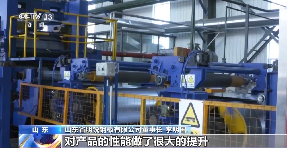 山東省明銳鋼板有限公司董事長 李明國:我們這個鍍鋁鋅產品,對產品的性能做了很大的提升,主要出口越南、泰國、巴西、土耳其等地方。像黃金色的,或者雙面綠、單面綠顏色,主要是針對出口,都是定制產品。