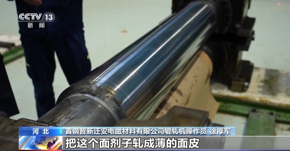 首鋼智新遷安電磁材料有限公司輥軋機操作員 徐厚軍:這就是軋制和帶鋼直接接觸的工作輥,如果說家里搟面的話,這就是我們的搟面杖。那個鋼鐵材料就相當于面劑子,我們就用這個搟面杖,通過擠壓,把這個面劑子軋成薄的面皮。6個搟面杖串起來,一遍就軋出來了。生產效率比傳統(tǒng)生產方法高了8倍到10倍,這條機組軋制速度是1500米每分鐘,相當于高速公路上以時速90公里開的小車一直在跑。