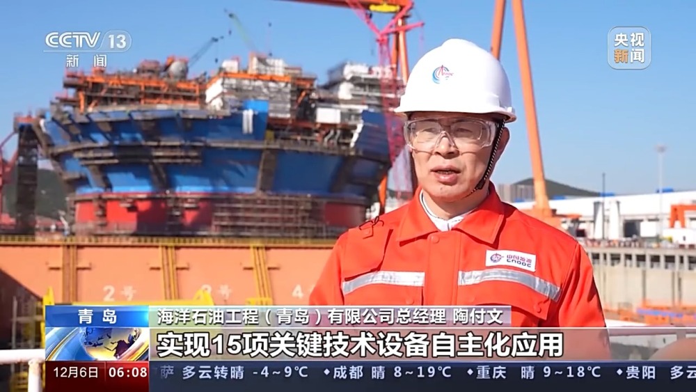 海洋石油工程(青島)有限公司總經(jīng)理 陶付文:創(chuàng)新采用一體化建造工藝和雙龍門吊集成技術(shù),實(shí)現(xiàn)15項(xiàng)關(guān)鍵技術(shù)設(shè)備自主化應(yīng)用,使我國(guó)具備了根據(jù)不同油田、不同海域,自主設(shè)計(jì)制造不同類型深水油氣裝備的能力。