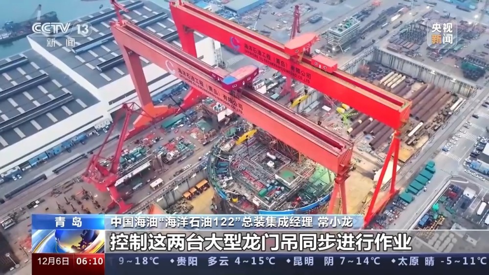 中國(guó)海油“海洋石油122”總裝集成經(jīng)理 常小龍:我們是通過(guò)數(shù)字化系統(tǒng),控制這兩臺(tái)大型龍門吊同步進(jìn)行作業(yè),創(chuàng)新采用了插尖輔助定位技術(shù),插尖都在每個(gè)模塊下部,每個(gè)都有十幾個(gè)插尖,我們最終給它的定位精度控制在了4毫米以內(nèi),我們這樣的方式也加快了整體作業(yè)效率,平均每?jī)商斓跻粋€(gè)模塊,整體作業(yè)效率提高了50%以上。