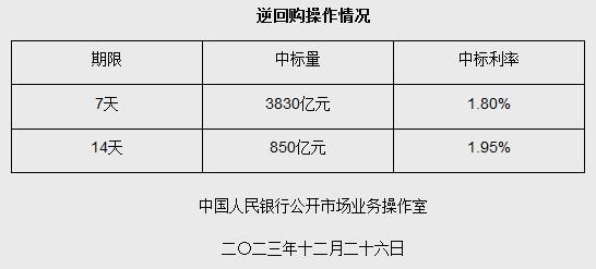 中新網(wǎng)12月26日電 據(jù)央行網(wǎng)站消息,為維護(hù)年末流動(dòng)性合理充裕,2023年12月26日人民銀行以利率招標(biāo)方式開(kāi)展了4680億元7天期和14天期逆回購(gòu)操作。具體情況如下: