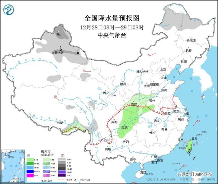 12月28日08時至29日08時,新疆北部、內蒙古東北部、黑龍江西北部、西藏東南部、陜西中部等地部分地區(qū)有小雪或雨夾雪,其中,新疆沿天山地區(qū)和北疆北部等地部分地區(qū)有中到大雪(5~8毫米)。陜西南部、河南南部、西南地區(qū)東部、臺灣島等地部分地區(qū)有小到中雨,其中,臺灣島東部和南部等地部分地區(qū)有大雨(25~40毫米)。青海西部、甘肅河西、內蒙古中部等地部分地區(qū)有5~6級風(見圖2)。