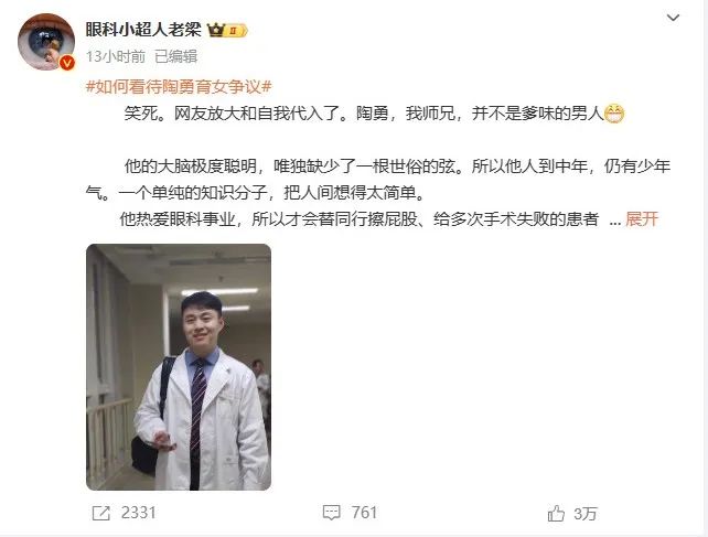 12月24日深夜,擁有超330萬(wàn)粉絲的醫(yī)生大V“眼科小超人老梁”發(fā)長(zhǎng)文力挺陶勇,稱(chēng)他是自己的師兄,并不是爹味的男人。文中提到: