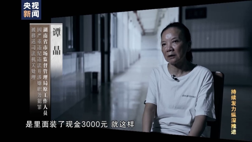 湖南省市場監(jiān)督管理局原工作人員 譚晶:他就拿了一個信封,在沒人的地方他就悄悄塞給我,他說是我們單位的資料。然后我回去以后發(fā)現(xiàn)是里面裝了現(xiàn)金3000元,就這樣。所以我不逃避我自己的(責任),犯了法要承擔法律的責任,一定要。