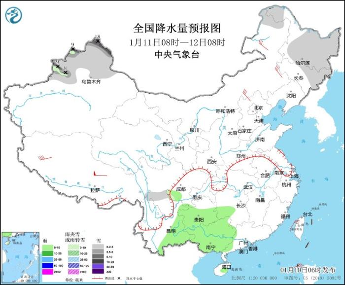 1月11日08時至12日08時,內(nèi)蒙古東北部、黑龍江大部、吉林東部、新疆北部、川西高原南部等地部分地區(qū)有小到中雪或雨夾雪,其中,新疆北部塔城、阿勒泰地區(qū)和伊犁河谷等地局地有大到暴雪(10~18毫米)。貴州中南部、云南東部、廣西、湖南西南部、海南島中部等地部分地區(qū)有小雨。內(nèi)蒙古中東部、河北北部等地部分地區(qū)有5~6級風;黃海中北部、臺灣海峽、巴士海峽、南海東北部和西南部等海域有6~7級風、陣風8級。